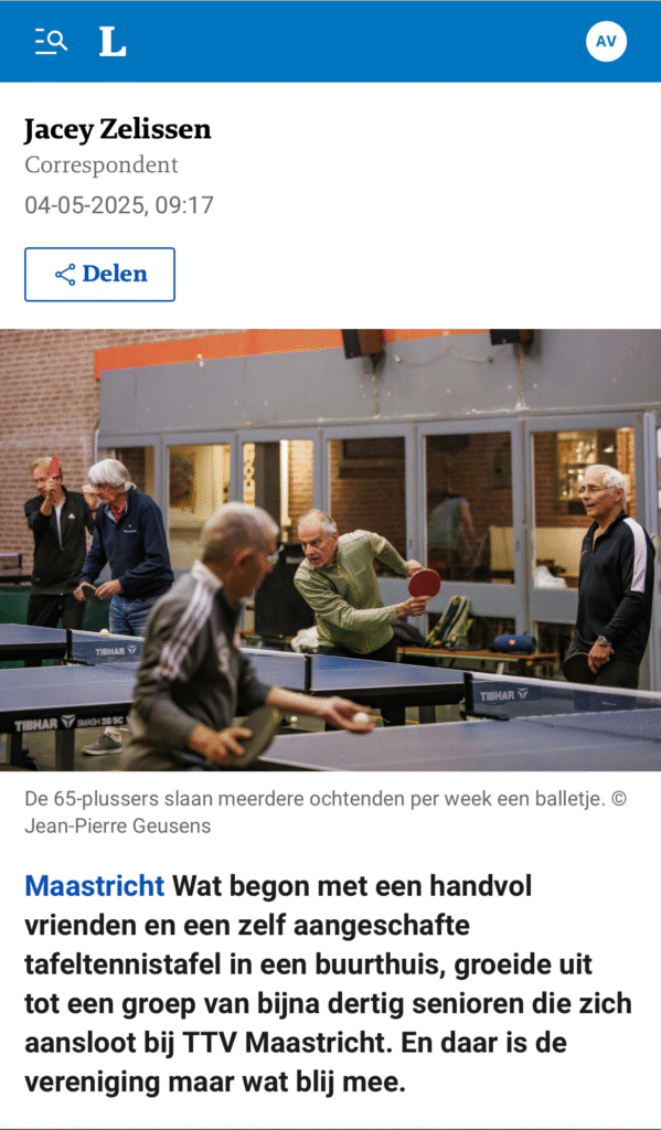 Alweer een paar maanden geleden stond TTV Maastricht in de Limburger, met een artikel over hoe de vereniging is gegroeid met een groep senioren die overdag trainen.